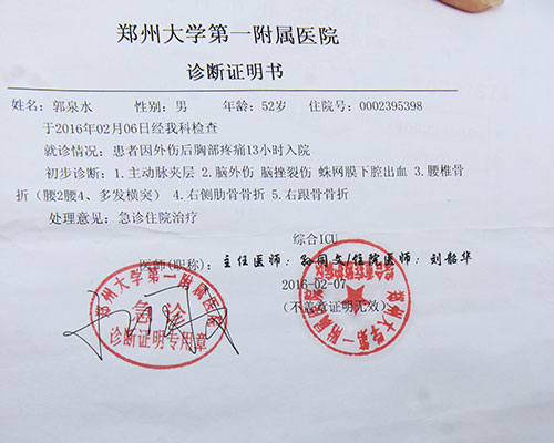 22日上午,记者在郑大一附院见到了郭泉水及其大女儿郭亚飞,2月6日凌晨,他们租住的楼房起火,因火势太大楼道被封,郭家人决定利用床单从窗户逃生,谁知在逃生过程中床单拉脱,郭泉水一双儿女直接掉了下去,郭泉水见儿女摔落后无应声,情急之下,也跟着跳了下去。经检查,郭泉水的一双儿女均腰椎、肋骨及脚踝等多处骨折,而郭泉水不仅脑外伤、腰椎、肋骨骨折这些多发外伤,还诱发了主动脉夹层。郭泉水因伤势过重转入郑大一附院ICU病房,由在郑州工作的大女儿郭亚飞照顾,其儿女在平顶山市第二人民医院住院治疗。